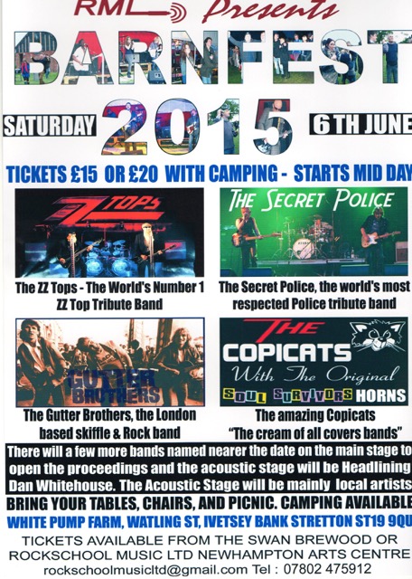 Sat 6th Stafford BarnFest. We are headlining this festival which is being staged on one of the sites used for the V festival. Address is White Pump Farm, Watling Street, Ivetsey Bank, Stafford ST19 9QU. Tickets are £15 for the day or £20 with camping. Call 07802 475912 or email rockschoolmusic@gmail.com for more details. You can download the poster here